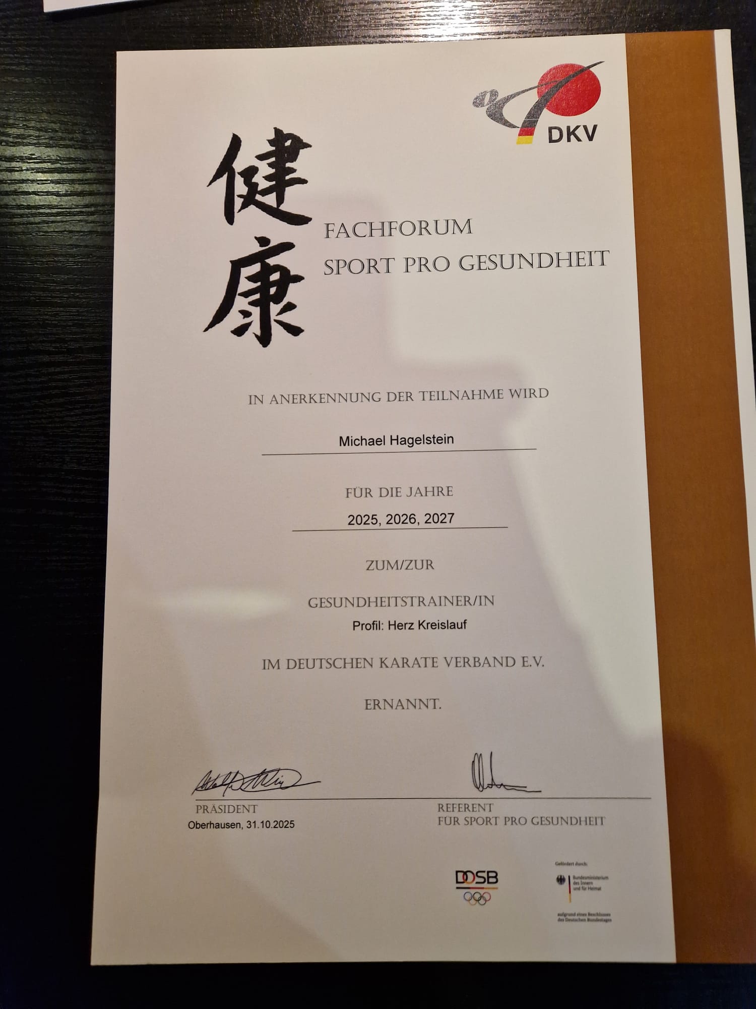 Unsere beiden Trainer, Frank Debecker und Michael Hagelstein, bestehen am 31.10.2025 die Prüfung zum Gesundheitstrainer – zudem wird unser Verein zum Stützpunkt für Gesundheitsprävention im Deutschen Karate Verband e.V. ernannt.